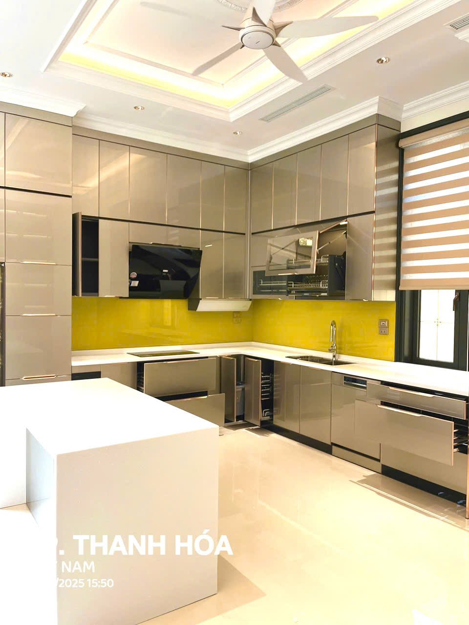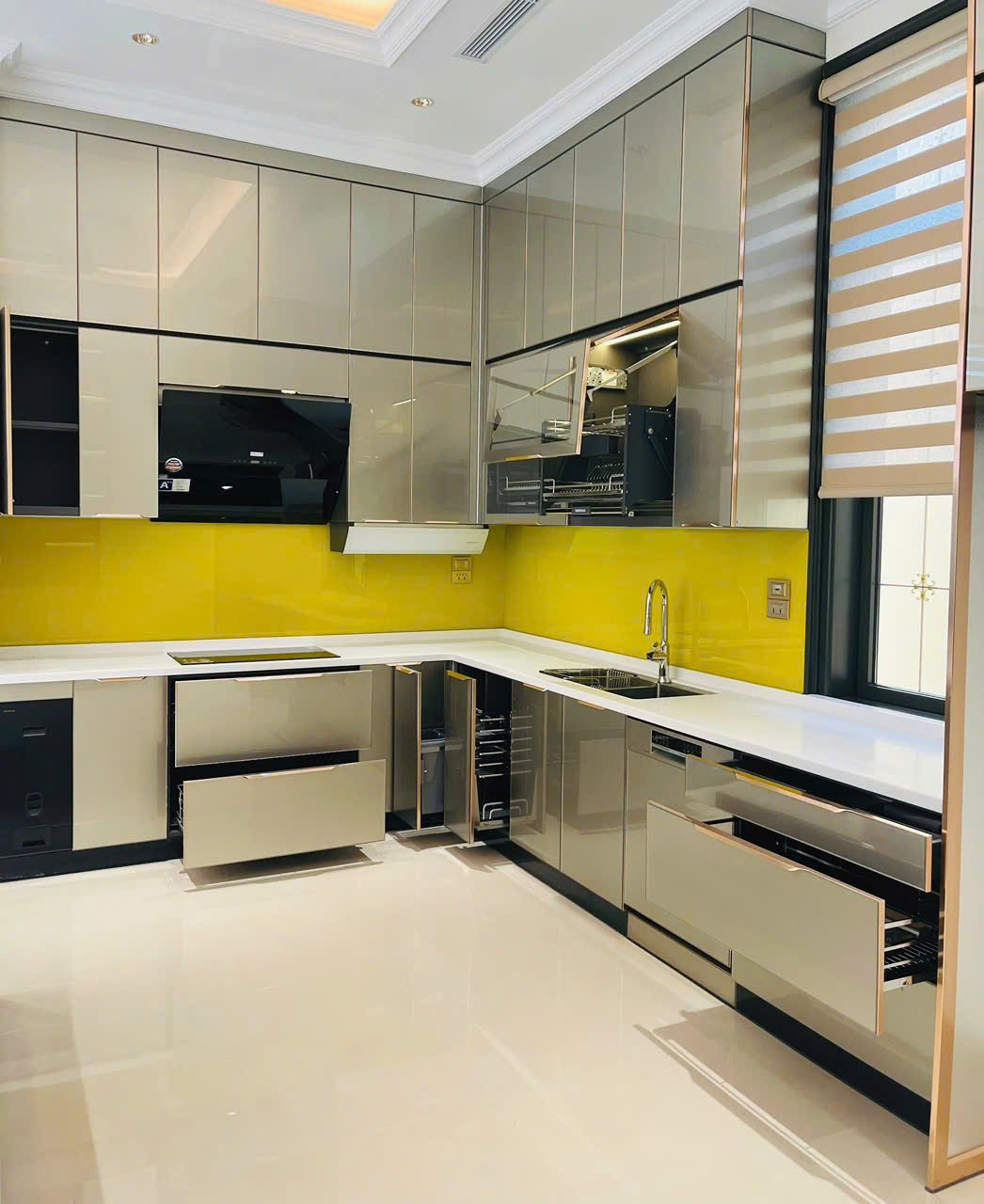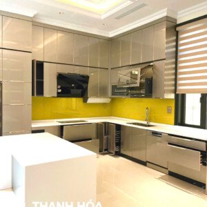 - Cánh tủ bếp sử dụng kính cường lực dày 5mm cho khả năng chống va đập, chống xước, chịu nhiệt và không giãn nở. Mặt sau kính được phủ sơn màu tùy chọn, công nghệ sơn nhiệt sẽ đảm bảo không bong tróc, xuống màu.