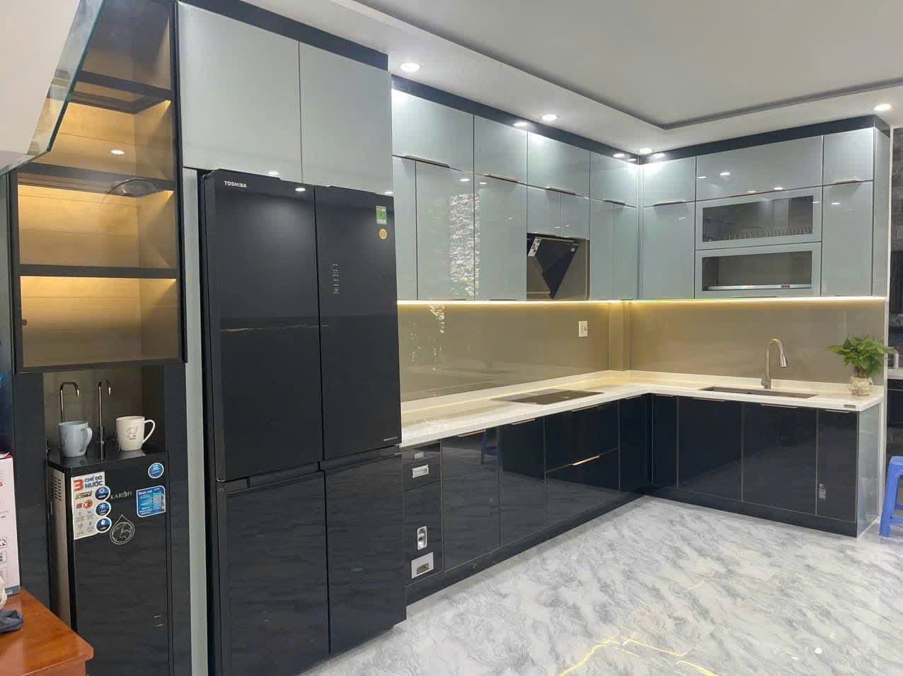 • Cánh tủ bếp sử dụng kính cường lực dày 5mm cho khả năng chống va đập, chống xước, chịu nhiệt và không giãn nở