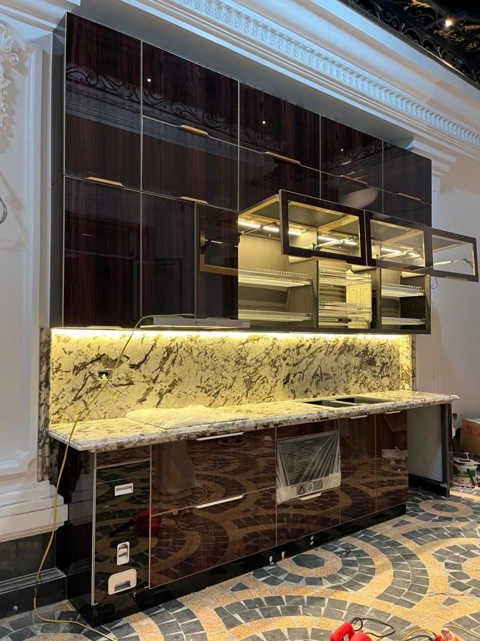 • Cánh tủ bếp sử dụng kính cường lực dày 5mm cho khả năng chống va đập, chống xước, chịu nhiệt và không giãn nở. Mặt sau kính được phủ sơn màu tùy chọn, công nghệ sơn nhiệt sẽ đảm bảo không bong tróc, xuống màu.
